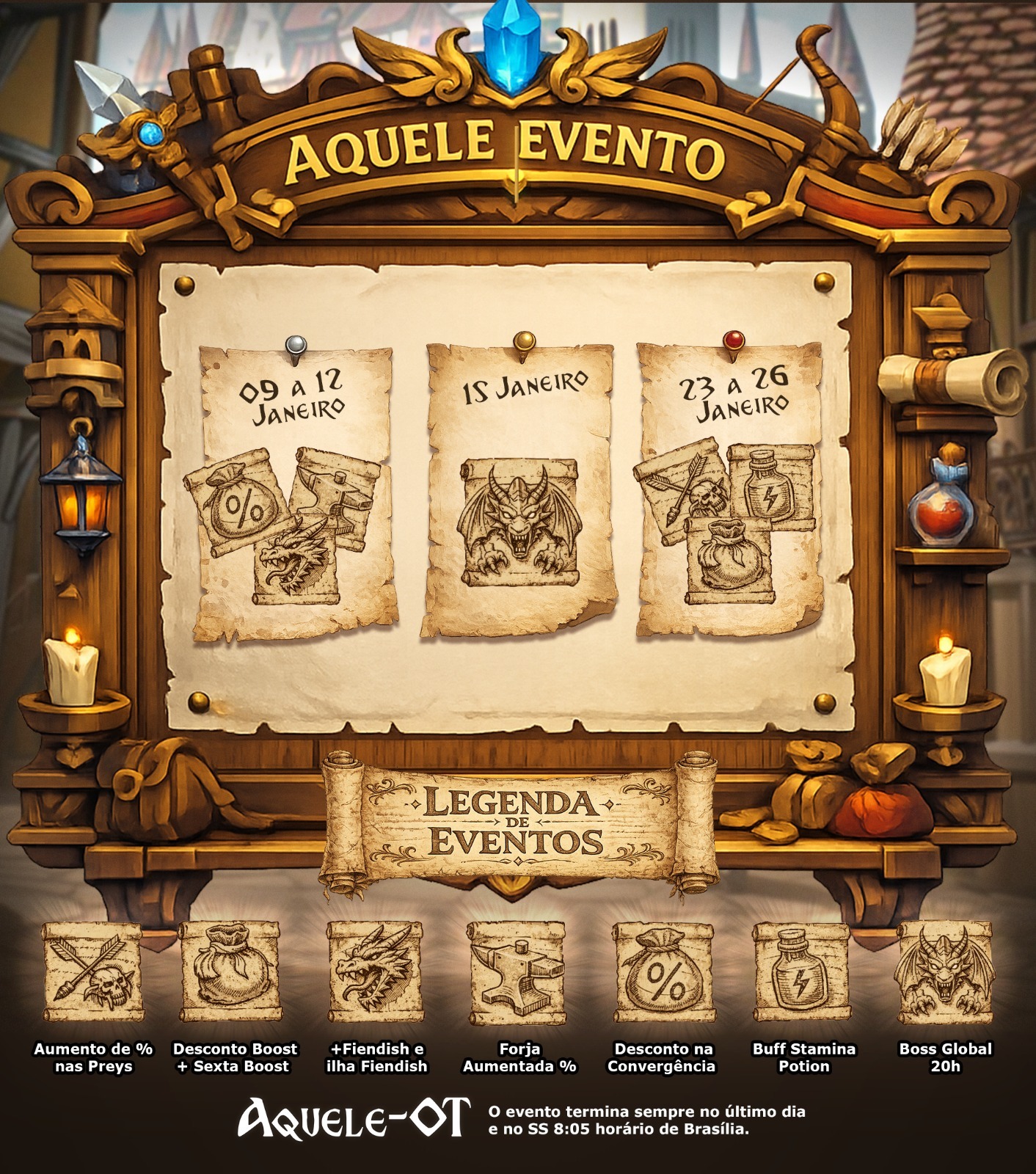 O Aquele OT acaba de passar por mais um ano de vida e gostaríamos de agradecer a todos os players que fizeram parte dessa jornada. Seguimos aprendendo e lançando atualizações visando uma melhor gameplay para todos. O ano de 2025 foi um ano de inúmeros updates e novas mecânicas e conteúdos chegando ao servidor. Nosso foco será continuar inovando em 2026, buscando melhorar a experiência de todos no servidor. Para os amantes dos pacotes mensais, com a chegada do dia 5, os pacotes mensais foram atualizados e os dois pacotes comemorativos do Natal foram removidos. Esperamos que tenham aproveitado para upar seus personagens durante todos os eventos que estavam disponíveis no mês de dezembro.