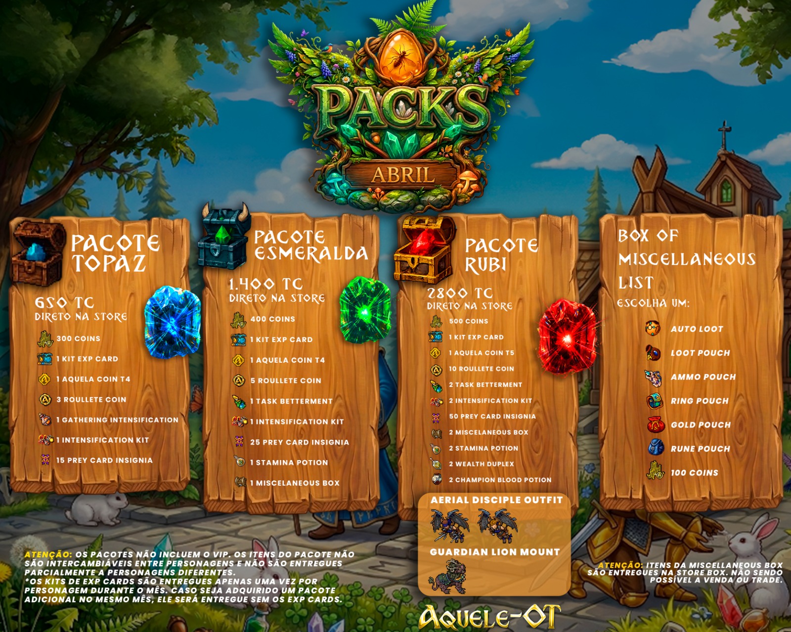 Neste mês, o grande destaque dos pacotes mensais é o Pack Rubi, que inclui o outfit Aerial Disciple e a mount Guardian Lion. Além disso, os jogadores podem personalizar as cores da Guardian Lion, deixando o kit ainda mais exclusivo. Confira todos os itens disponíveis nos pacotes e eventos nas imagens abaixo.
